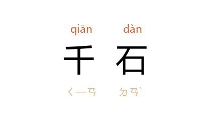 ⒈ 石,容量单位。秦汉官品的高低,常以俸禄的多少计算,从二千石递减至百石止。古代年俸一千石以上的官员品级较高,因以“千石”指高官。