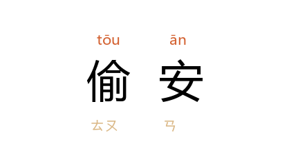 引三国魏·钟会〈移蜀将吏士民檄〉:「若偷安旦夕,迷而不返,大兵一放,玉石俱碎。」《红楼梦·第四五回》:「探春道:『你虽不会作,也不要你作,你只监察著我们里头有偷安怠惰的,该怎么样罚他就是了。』」