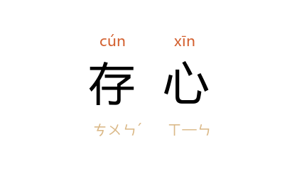 例如:「存心不良」、「存心梗直」、「你分明是存心想陷害人。」