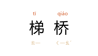 ⒈ 突起的拱桥,因其两边阶级如梯,故称。 唐 韩愈 有《奉和虢州刘给事使君三堂新题二十一咏·梯桥》。