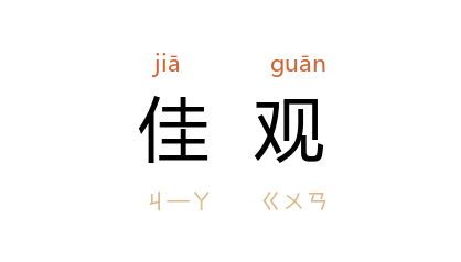 引北魏 郦道元 《水经注·汝水》:“平南王 肃 起高臺於小城,建层楼於隅阿,下际水湄,降眺粟渚,左右列榭,四周参差竞跱,奇为佳观也。”唐 韩愈 《南溪始泛》诗之三:“羸形可舆致,佳观安可掷。”