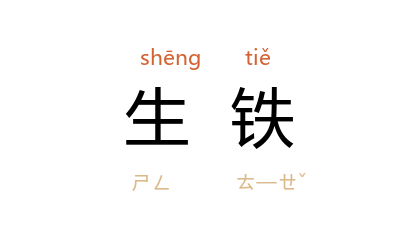 ⒈ 含铁的矿石,经鼓风炉冶炼,所得到最初的粗铁。含碳量较高,性质既硬且脆。可继续锻炼,除去碳和杂质,来制造熟铁或钢等。