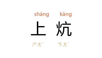 ⒈ 犹上床。炕,北方人用土坯或砖砌成的一种床,底下有洞,可生火取暖。