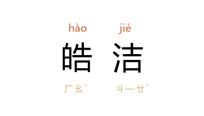 引唐 徐彦伯 《比干墓》诗:“玉牀逾皜洁,铜柱方歊焮。”明 徐弘祖 《徐霞客游记·粤西游日记二》:“稍后则 老君 危然,鬚眉皓洁,晏坐而对之,皆玉乳之所融结。”清 曹寅 《月上归至西轩》诗:“谁知竹西月,皓洁在 莎厅。”