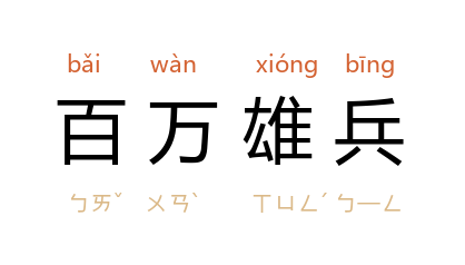 ⒈ 兵力十足,军威壮盛的军队。宋·赵葵〈南乡子·束发领西藩〉词:「束发领西藩,百万雄兵掌握间。」也作「百万雄师」。