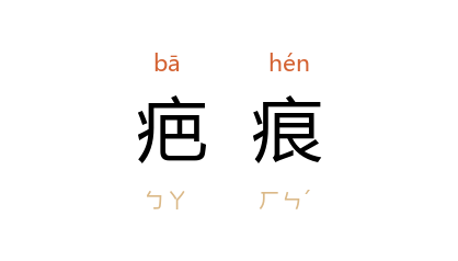 ⒈ 疮口或伤口愈合后留下的痕迹。亦指器物上像疤的痕迹。