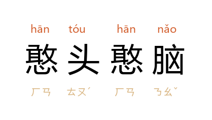 引杨朔 《北线》十六:“李全喜 也不多说,憨头憨脑地笑着朝后楼一个小窗指了指。”陈世旭 《打赌》:“你这个每天只晓得缩在角落里,憨头憨脑地用锉刀创造噪音的人,是享受不到无花果的。”