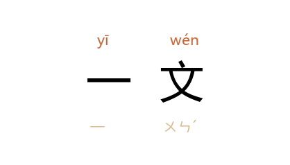 ⒈ 一条斑纹。指事物的一小部分。一篇文章。一枚铜钱。旧时铜币皆有文字,说明其值,故名。方言。一块银元。徐珂《清稗类钞·方言类》:“广州方言:一块银元,呼作一文。”指一句文辞。