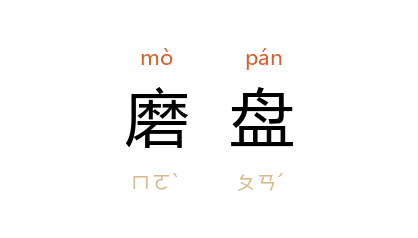 ⒉ 碾碎谷物的工具,通常是用两块圆形石盘上下组合而成的。