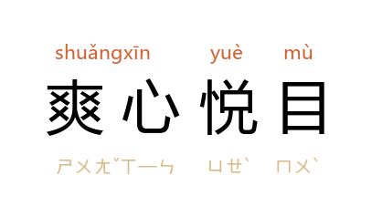 例如:「郊外山峦青翠,稻田绿油油,十分爽心悦目。」