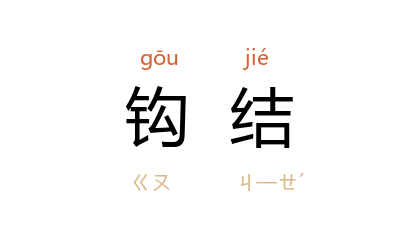引《太平广记》卷一〇一引 唐 李复言 《续玄怪录·延州妇人》:“众人即开墓,视遍身之骨,鉤结皆如锁状。”明 危素 《大元故翰林侍讲学士谥文献黄公神道碑》:“姦民以伪钞鉤结党与,胁攘人财。”