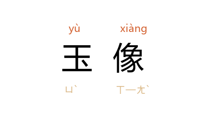 引《南史·夷貊传上·南海诸国》:“晋 义熙 初,始遣使献玉像,经十载乃至。像高四尺二寸,玉色洁润,形制殊特,殆非人工。”唐 王建 《题应圣观》诗:“空廊鸟啄花砖缝,小殿虫缘玉像尘。”《宋史·乐志十五》:“金舆玉像下瑶京,綵仗拥霓旌。”元 张宪 《举几行》:“含章殿 前玉像毁,画轮车发宫门起。”