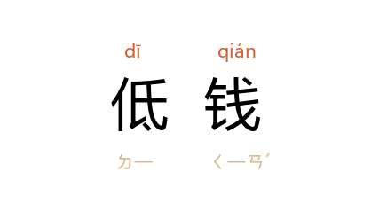 引《醒世姻缘传》第十五回:“怎当 梁 胡 二人半个低钱也不曾带了出来,空饿得叫苦连天,却拿甚么买吃?”清 孔尚任 《桃花扇·眠香》:“丑接钱再数,换低钱。”王季思 等注:“换低钱--意是把成色差一些的钱换过。”
