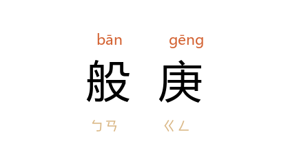 引《左传·襄公九年》:“祀 盘庚 于西门之外。”陆德明 释文:“盘,字亦作般,步干反。”《汉书·翼奉传》:“成王 徙 洛,般庚 迁 殷。”《后汉书·文苑传上·杜笃》:“昔 般庚 去奢,行俭於 亳。”