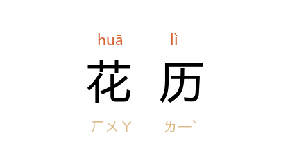 ⒈  依各种花的开落以定岁时。如正月:兰蕙芳;二月:桃夭;三月:蔷薇蔓等。明程羽文撰有《花历》,其序云:“花有开落凉燠,不可无历,秘集月令,颇与时舛,予更辑之,以代絜壶之位,数白记红,谁谓山中无历日也。”