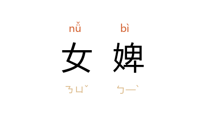 引康有为 《大同书》甲部第一章:“若其女婢,贱辱由人。主妇之慈,破被残羹;主妇之酷,钳炙烙身。”郭沫若 《喀尔美萝姑娘》:“他的老母是那贵族家里的女婢。”