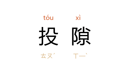 引《列子·说符》:“投隙抵时,应事无方,属乎智。”宋 陆游 《雀啄粟》诗:“乘时投隙自谓才,苟得未必为汝福。”明 何景明 《敌中篇》:“然卒为所图焉者,彼有以揣摩投隙,而此有以中之也。”《续资治通鉴·宋宁宗真定七年》:“如 耶律德光 之不能即安中土,则姦雄必将投隙而取之。”