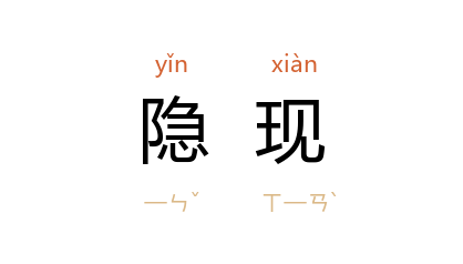 引清 林则徐 《中秋炮台眺月》诗:“三山倒影入海底,玉宇隐现开琼楼。”丁玲 《阿毛姑娘》第一章四:“在这山洼里,隐现着许多精致的小屋。”艾青 《旷野》诗:“前面只隐现着,一条渐渐模糊的灰黄而曲折的道路。”