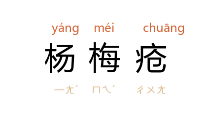 亦省称“杨梅”。 《医宗金鉴·外科心法要诀·疳疮》:“生杨梅时,或误用熏、搽等药以致腐烂如臼者,名杨梅疳。”