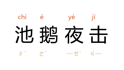 ⒈ 唐 代 安 史 之乱后, 吴元济 继 李希烈、吴少诚、吴少阳 等人之后,割据 淮西。李愬 奉命讨伐,在夜袭首府 蔡州 时,城边有鹅鸭池, 愬 令击之以混声。至城下,无一人发觉,遂攻破 蔡州城,生擒 吴元济,平定了 淮西。后以“池鹅夜击”作为出奇制胜的典故。