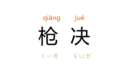⒈ 以枪杀做为执行死刑的方式。也作「枪毙」、「鎗毙」、「鎗决」。