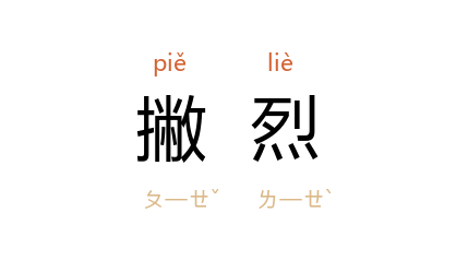 引唐 杜甫 《留花门》诗:“渡河不用船,千骑常撇烈。”唐 杜甫 《荆南赵公大食刀歌》:“鬼物撇捩辞坑壕, 苍水 使者捫赤絛。”明 刘基 《钧天乐》诗:“飊轮撇捩三岛过,海水尽是青玻璃。”明 吴昜 《定襄侯郭忠武公登》诗:“撇烈天网翻,槎枒地龙绕。”清 黄鷟来 《题毛闇斋采芝图》诗:“撇挒若秋鹰,清风渺难攀。”