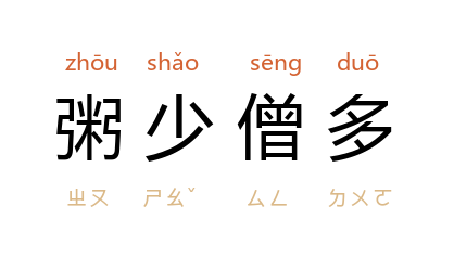 例如:「每年有这么多人参加考试,然而粥少僧多,注定有许多人要落榜的。」