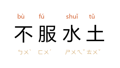 ⒈ 服:习惯;水土:指一地的饮水、气候、环境等。不能适应某一地区的气候、饮食等。
