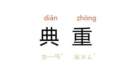 引宋 李清照 《词论》:“又 晏 苦无铺叙; 贺 苦少典重; 秦 即专主情致,而少故实。”元 辛文房 《唐才子传·杜甫》:“昔谓 杜 之典重, 李 之飘逸,神圣之际,二公造焉。”明 方孝孺 《与苏先生书》之三:“徐公 之文简质典重,有浑然之气。”朱自清 《三家书店》:“所展览的,幽默,秀美,粗豪,典重,各擅胜场。”