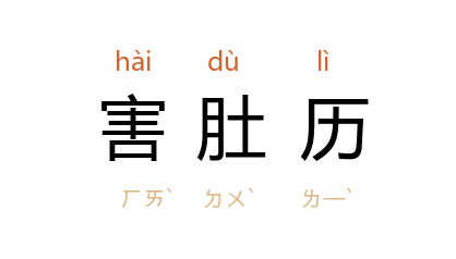 ⒈ 见“害肚历”。亦作“害肚歷”。 宋 制,馆阁官员每夜轮一人值宿,如因故不能值宿,则于名下写上“肠肚不安”,故馆阁宿历(值宿登记本)相传谓“害肚历”。
