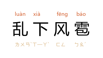 引元 关汉卿 《单刀会》第一折:“关云长 听的闹,他可便乱下风雹。”明 无名氏 《桃符记》第二折:“他端的乱下风雹。”亦作“乱下风颮”。 元 马致远 《任风子》第四折:“他待显耀雄豪,乱下风颮。”