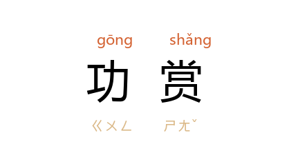 引《史记·秦本纪》:“孝公 於是布惠,振孤寡,招战士,明功赏。”《汉书·宣帝纪》:“故丞相 安平侯 敞 等居住守职,与大将军 光 、车骑将军 安世 建议定策,以安宗庙,功赏未加而薨。”宋 苏辙 《乞罢修河司札子》:“宣德郎 李伟 輒敢献言欲闭塞北流,回復 大河,力排众议,侥倖万一,私覬功赏。”