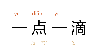引方志敏 《可爱的中国·清贫》:“为革命而筹集的金钱,是一点一滴的用之于革命事业。”叶圣陶 《友谊》一:“要在日常生活里头一点一滴的小事上学习这些个英雄人物。”巴金 《<随想录>总序》:“我愿意一点一滴地做点实在事情,留点痕迹。”