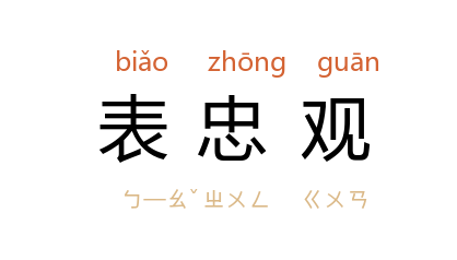 ⒈ 观名。在浙江省杭州市涌金门外,今称钱王祠,宋熙宁中赵抃所建,用以表彰吴越钱氏的功德。后赐名为表忠观。明嘉靖中曾改筑。祠内镌有苏轼表忠观碑文,今全文八幅系后人摹刻。