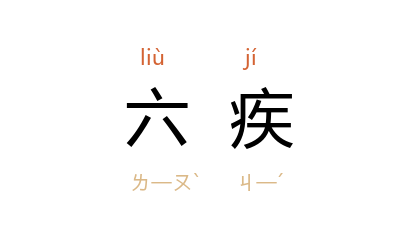 ⒈ 六种疾病:寒疾、热疾、末(四肢)疾、腹疾、惑疾、心疾。