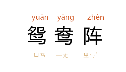 引明 戚继光 《练兵实纪·练营阵》:“外围兵将马退入队后,仍照鸳鸯阵,二马一列,联络拴伴如式,务要队伍分明,兵俱趋出马前,立成鸳鸯阵势,鸣锣坐定。”