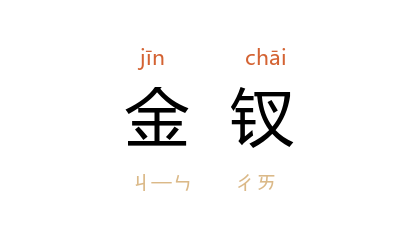 ⒈ 古代妇女的首饰,以金制成,状似簪,尾端分叉为二股,可用来固定发型。