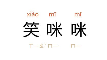 引孙犁 《秀露集·克明<荷灯记>序》:“主题鲜明乐观,和他那总是笑咪咪的模样相仿。”韦君宜 《似水流年·两村行》:“那位笑咪咪的队长坐在椅上。”王蒙 《悠悠寸草心》:“传达立刻笑咪咪地递给我一个入门证。”