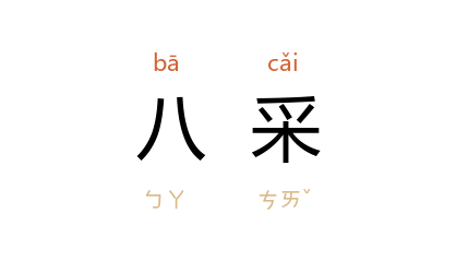 ⒊ 《孔丛子·居卫》:“昔尧身修十尺,眉分八采。”后因以“八彩”指尧眉或形容帝王容颜。