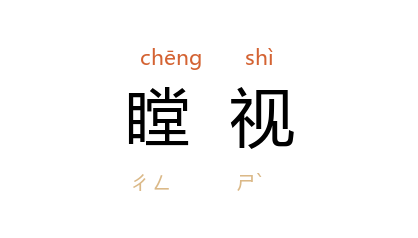 引郑观应 《盛世危言·税则》:“所用洋人扦手,类皆袒护洋商而漠视 华 商,同为一色之货,竟估二种之价。于是 华 商怏怏而控之关道,关道惶惶而问之税司,税司茫茫而委之扦子。率从初议,使纳重税,关道瞠视之,无如何也。”阿英 《<敌后日记>摘抄·七月十四日》:“因待晚饭,彼等遂闲着棋,余不识棋,只能瞠视而已。”