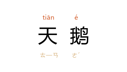⒈ 动物名。雁形目雁鸦科。游禽鸟类。形似鹅,体大颈长,上嘴有黄色的瘤,全体纯白或黑。分布于寒带,栖于水滨,善飞,吃植物、昆虫等。