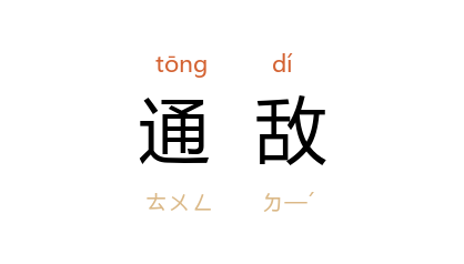 引清 叶廷琯 《鸥陂渔话·温体仁家书》:“明 季督师 袁崇焕 之狱,当时帝意,谓其通敌召兵,故加严谴。”秦兆阳 《大地》第三卷四:“咱们闹义和团那时候,要不是朝廷里偷偷儿通敌卖国,咱们还败得了?”