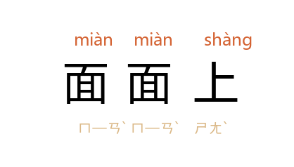 引柳青 《狠透铁》三:“老监察瞪着眼说:‘ 王以信 他们根本是面面上应付哩,心里恨死了合作化。’”贺敬之 等《惯匪周子山》:“眼看着太阳落西山, 周子山 扛镢头回家转;面面上我种庄稼,心里可不是庄稼汉。”贺敬之 等《惯匪周子山》:“你留在这搭埋伏下,暗地里给我们做事,面面上还是装个红的眉眼。”