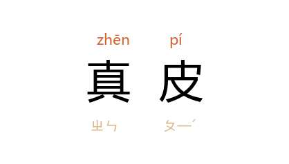 ⒈ 脊椎动物皮肤的内层。介于表皮与内皮之间,由纤维的结缔组织而成,内有血管、神经、神经末梢及毛囊、汗腺及皮脂腺等。