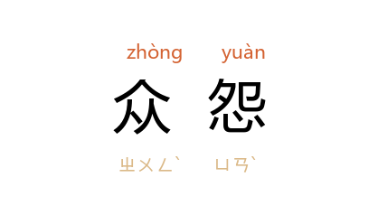 引《战国策·齐策五》:“兵穷而好敌强,国罢而好众怨。”鲍彪 注:“乐与众为怨。”清 昭槤 《啸亭杂录·朱白泉狱中上百朱二公书》:“白泉 以 王文成 自许,二人皆笑其妄,然不期其终以任事犯众怨,自攖其罪。”清 夏燮 《中西纪事·粤民义师》:“无端而招众怨,举足而蹈危机。”