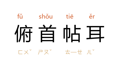 ⒈ 低头垂耳。形容恭顺驯服的样子。明·朱国桢也作「伏首帖耳」、「伏首贴耳」、「俯首贴耳」、「俛首帖耳」、「俛首贴耳」。