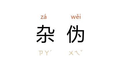 引《宋书·颜竣传》:“愚谓宜听民铸钱,郡县开置钱署,乐铸之家,皆居署内,平其准式,去其杂伪。”《新唐书·礼乐志三》:“自 周 衰,礼乐坏于 战国 而废絶于 秦。汉 兴,《六经》在者,皆错乱、散亡、杂伪,而诸儒方共补缉,以意解詁,未得其真,而讖纬之书出以乱经矣。”