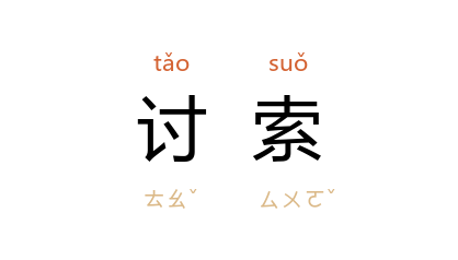 引《歧路灯》第四六回:“王中 也不敢问 老贾 讨索的是何款项。”郑观应 《盛世危言·公法》:“至所犯之事,或置而不论,或谅而概免,或执义讨索赔偿,均无不可。”茅盾 《子夜》四:“现在看见 费小胡子 竟掮着‘三先生’的牌头来上门讨索, 曾沧海 觉得非惩他一下不可了。”