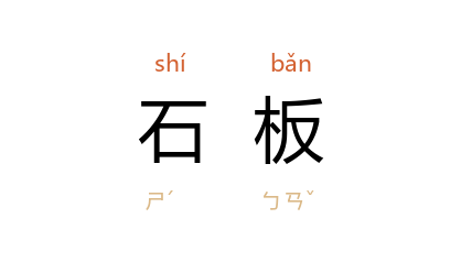 ⒈ 亦作“石版”。片状的石头。一种文具。以石笔在上面写字,多为儿童习字之用。