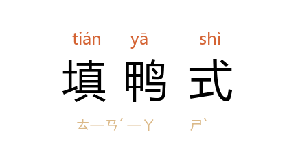 ⒈ 指注入式教学法。由于填鸭系强制喂食,故用以比喻只机械地对学生或学员灌输知识,而不注意对他们的理解能力和实际工作能力的培养的教学方法。